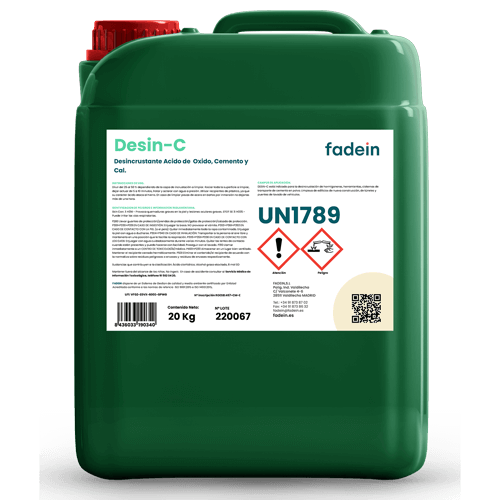 DESIN-C es un desincrustante ácido concentrado soluble en agua, especialmente formulado para la limpieza de hormigón, cemento, óxido, incrustaciones calcáreas, etc. Está indicado para la desincrustación de hormigoneras, herramientas, cisternas de transporte de cemento en polvo, limpieza de edificios de nueva construcción y túneles y puentes de lavado de vehículos.
